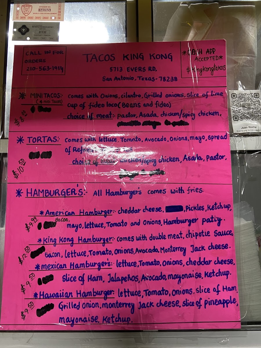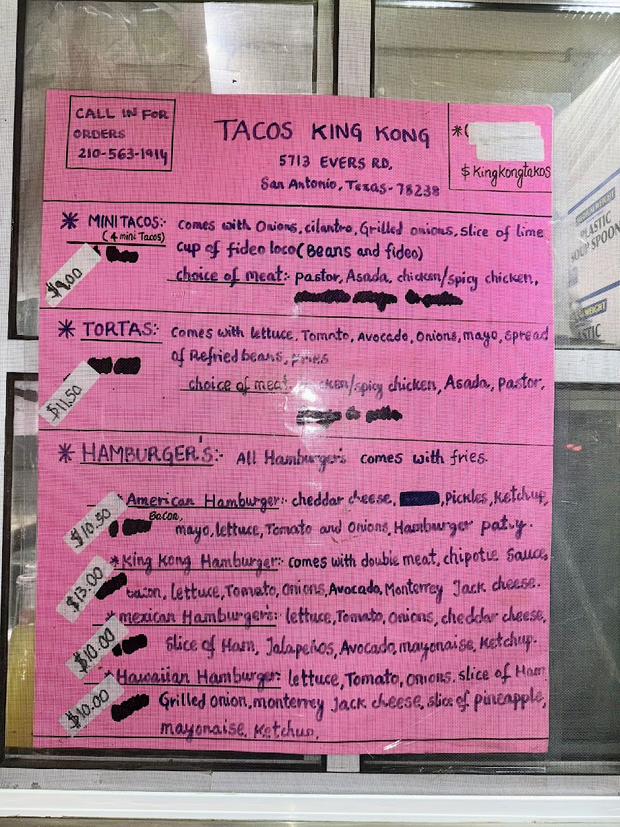 The menu at Tacos King Kong offers a satisfying range of classic Tex-Mex favorites that highlight bold flavors and generous portions, making it a reliable choice for both quick bites and hearty meals. Standout items like the Chicken Tacos and Chicken Fajitas Tacos showcase well-seasoned, tender chicken wrapped in soft tortillas, delivering a comforting and flavorful experience. The Chicken Quesadilla is a crowd-pleaser with its melty cheese and savory filling, while the Egg and Potato Tacos provide a simple yet delicious option, especially appealing for breakfast lovers. For those who enjoy smaller portions packed with flavor, the Pastor Mini Tacos offer a tasty combination of seasoned pork and fresh toppings, and the Taco De Asado stands out with its rich, grilled beef flavor that feels both authentic and satisfying. Overall, the menu balances variety and quality well, offering familiar favorites that are prepared with care, making it easy for customers to find something enjoyable every time they visit.